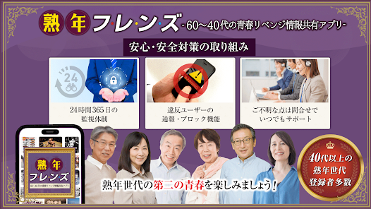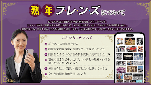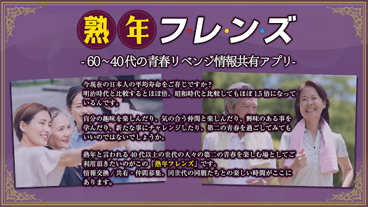 熟年フレンズ~60~40代の青春リベンジ情報共有アプリ~は、Project bandによって開発された、大人世代に向けたソーシャルネットワーキングアプリです。このアプリは、人生の第二幕に差し掛かる40代から60代のユーザーに、新たな友人や興味を共有できるプラットフォームを提供します。👫💬 意欲的で多様なメンバーが集うこのコミュニティは、趣味の探求や新しいチャレンジの共有に最適です。ユーザーエクスペリエンスにおいても、熟年フレンズはシンプルで直感的なデザインが施されており、使い勝手が良いのが特徴です。🌟🔍 そのため、テクノロジーが苦手な人でも安心して使うことができます。加えて、専門スタッフによる迅速なサポートを受けられることで、アプリの利用の際の不明点やトラブルもスムーズに解決可能。💡📞数あるSNSアプリの中から熟年フレンズを選んだ理由は、特にこの年代にフォーカスしている点が挙げられます。多世代型のSNSとは異なり、同世代の共通の関心や価値観を持った人々と出会える場を提供するこのアプリは、安心して交流を育むための理想的な環境を整えています。❤️🎉 それでは、このアプリのユニークな特徴を次に紹介します。さあ、あなたも新しい仲間に会いに行こう!いますぐダウンロードして体験してください!📲🌐